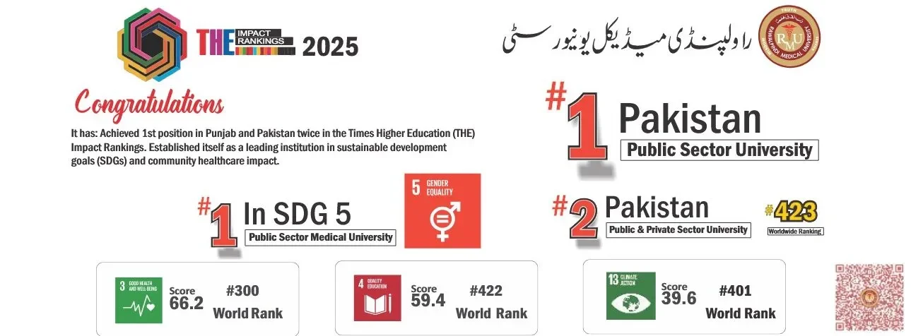 The Rawalpindi Institute of Cardiology (RIC) serves as a sister hospital of Rawalpindi Medical University (RMU), playing a vital role in clinical training, research, and patient care. As a specialized tertiary care cardiac center, RIC is fully affiliated with RMU, offering state-of-the-art facilities in cardiology, cardiothoracic surgery, cardiac anesthesia, and allied disciplines. This collaboration strengthens RMU’s academic excellence by providing undergraduate and postgraduate medical students hands-on experience in cardiac sciences, fostering advanced research, and ensuring quality healthcare delivery to the public. Together, RMU and RIC are committed to producing competent healthcare professionals and enhancing cardiovascular health outcomes in the region.