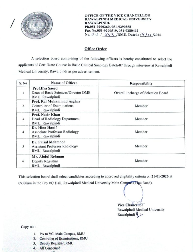 The Certificate Course in Basic Clinical Sonology (BCS) at Rawalpindi Medical University is a focused training program designed to equip medical professionals with essential skills in diagnostic ultrasound. This course provides hands-on experience and theoretical knowledge in areas such as abdominal, pelvic, obstetric, and small parts sonography, enabling practitioners to perform and interpret basic ultrasound examinations effectively. Tailored for general practitioners, emergency care providers, and junior doctors, the BCS program enhances diagnostic accuracy, particularly in primary care and resource-limited settings. With expert faculty, real-time scanning sessions, and case-based learning, the course bridges the gap between clinical suspicion and timely diagnosis, ultimately contributing to improved patient care and clinical outcomes.