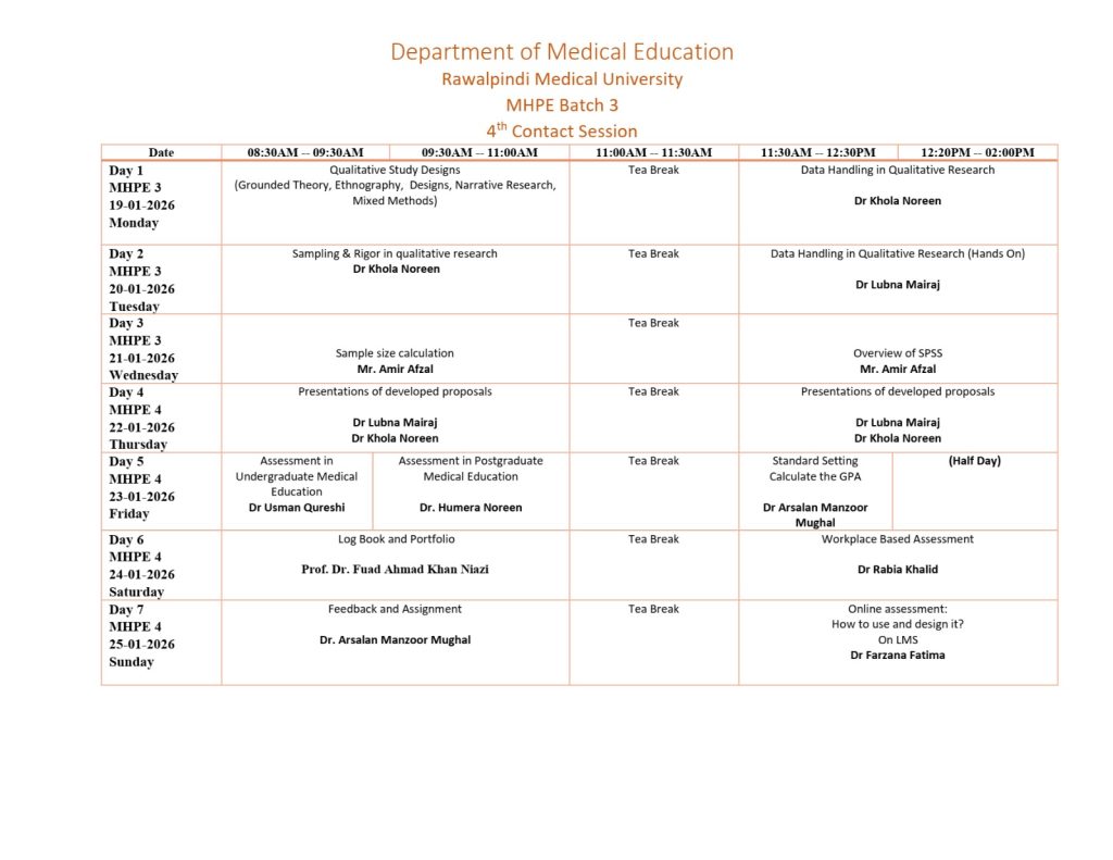 The Master in Health Professions Education (MHPE) at Rawalpindi Medical University is a prestigious postgraduate degree program designed to develop academic leaders, medical educators, and curriculum specialists in the field of health sciences education. This two-year program emphasizes advanced concepts in curriculum design, instructional strategies, assessment methods, faculty development, educational leadership, and research in medical education. It is ideal for faculty members, clinicians, and academic managers seeking to transform traditional medical teaching through innovation and evidence-based practices. The MHPE curriculum is delivered through interactive sessions, workshops, educational research projects, and practical assignments, enabling participants to become catalysts for academic excellence and institutional reform. Through MHPE, RMU reinforces its commitment to raising the standards of medical education and nurturing the next generation of academic leaders in Pakistan and beyond.