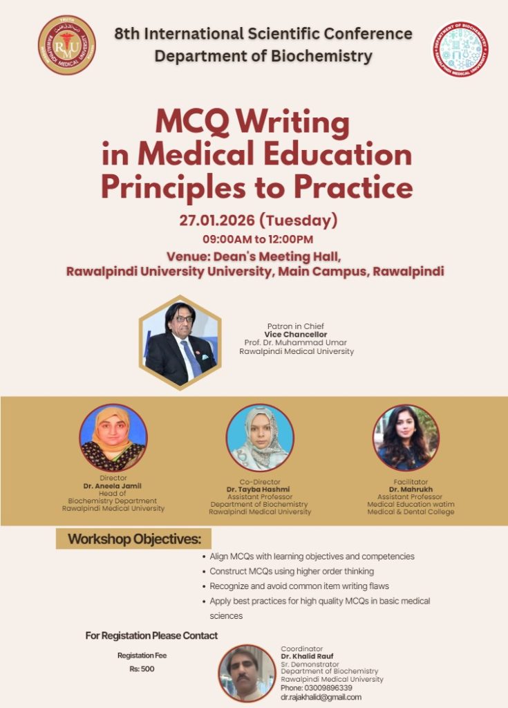 Through a blend of academic rigor, research excellence, and professional integrity, the Department of Biochemistry at Rawalpindi Medical University strives to nurture competent healthcare professionals capable of meeting modern medical challenges.