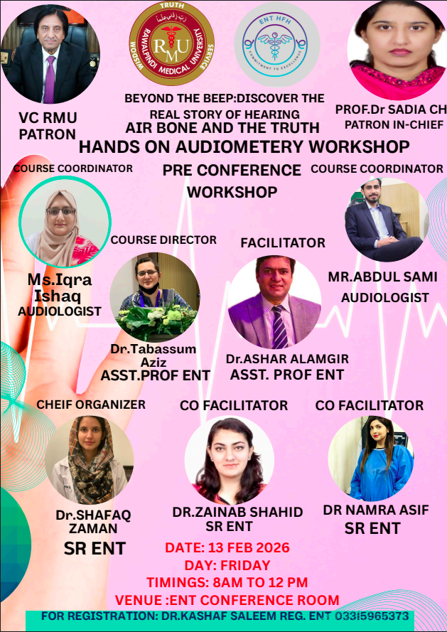 The Department of ENT and Head & Neck Surgery at Holy Family Hospital, Rawalpindi, is a 39-bedded facility providing comprehensive services through its outpatient department, fully equipped operation theatres, and 24-hour emergency coverage. Under the leadership of Assistant Professor Dr. Ashar Alamgir, the department comprises 1 Assistant Professor, 2 Senior Registrars, 13 Postgraduate Trainees, and 11 House Officers.