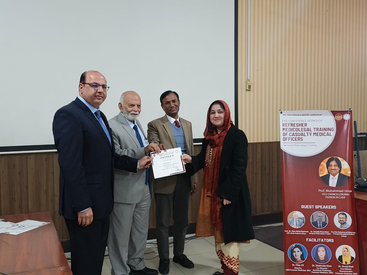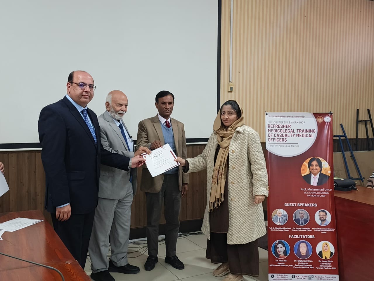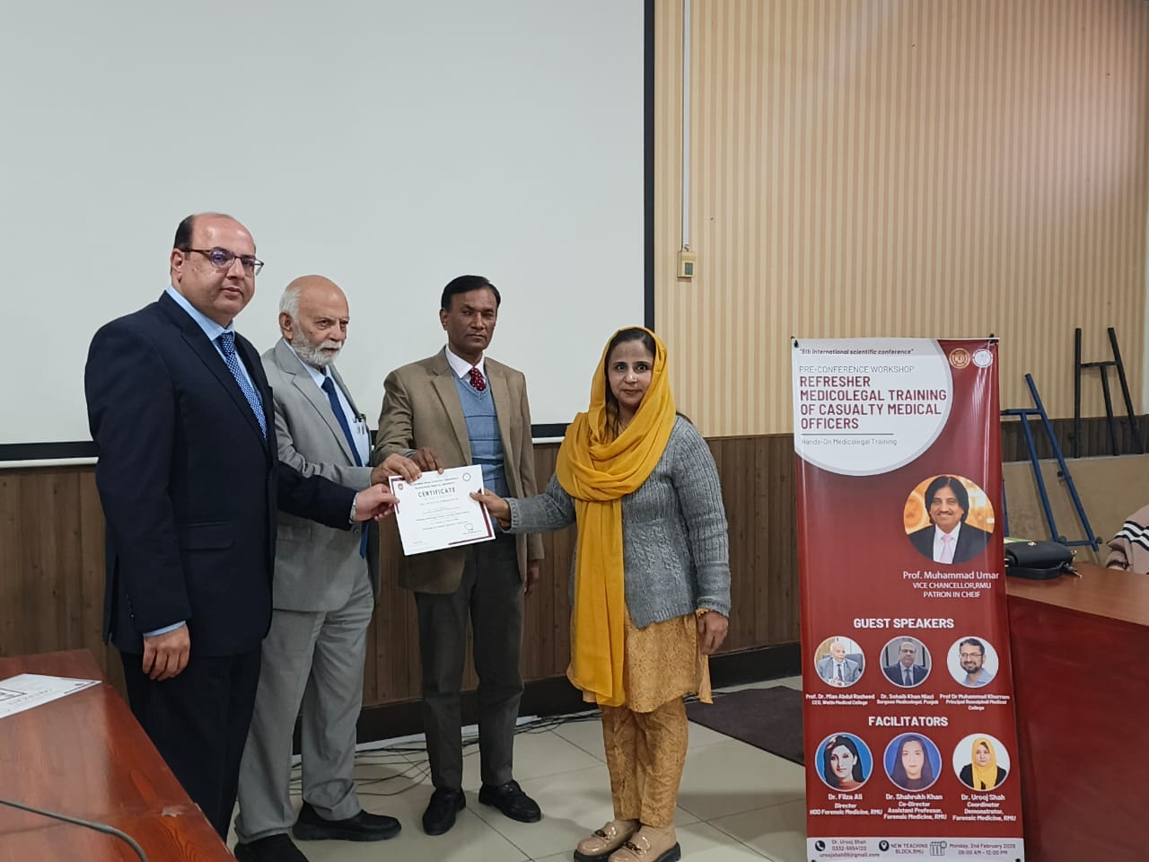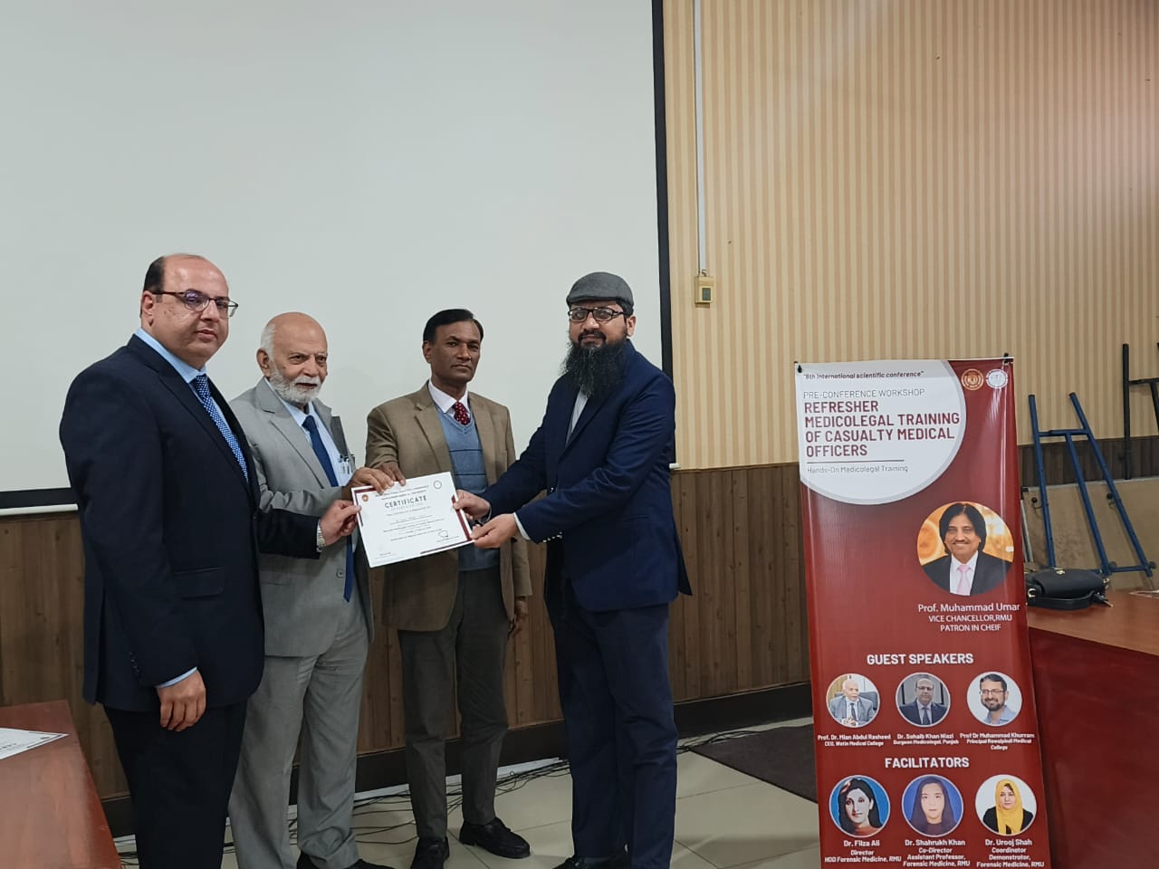 Preconference workshop on Medicolegal training of CMOs of all 3 teaching hospitals of RMU has been conducted successfully by Dept of Forensic Medicine at NTB today. Surgeon Medicolegal Punjab Dr Sohaib Khan Niazi and Dean of faculty of Forensic Medicine Prof Dr Mian AbdulRasheed were the guest speakers and had facilitated the Medicolegal training workshop today.
