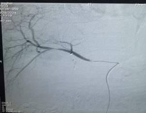 5. A 54-year-old male patient undergoes a laparoscopic cholecystectomy that is complicated by an unrecognised injury to an aberrant right hepatic artery (ARHA). Two weeks post-operatively, the patient presents with the classic Quincke's triad: right upper quadrant pain, obstructive jaundice, and gastrointestinal bleeding (hematemesis/melena) due to a progressive drop in hemoglobin. A subsequent CT angiography and selective angiogram confirm a growing vascular sac communicating with the hepatic artery
