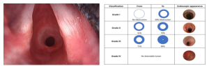 3. A patient presents with increasing shortness of breath and audible noisy breathing (stridor) following prolonged intubation. Flexible fiberoptic bronchoscopy reveals a subglottic stenosis where the tracheal lumen is visibly reduced to a small, pinhole opening, estimated to be less than 5% of the normal diameter, as shown in the image below. According to the Myer-Cotton Classification of subglottic stenosis, which grade corresponds to this finding?
