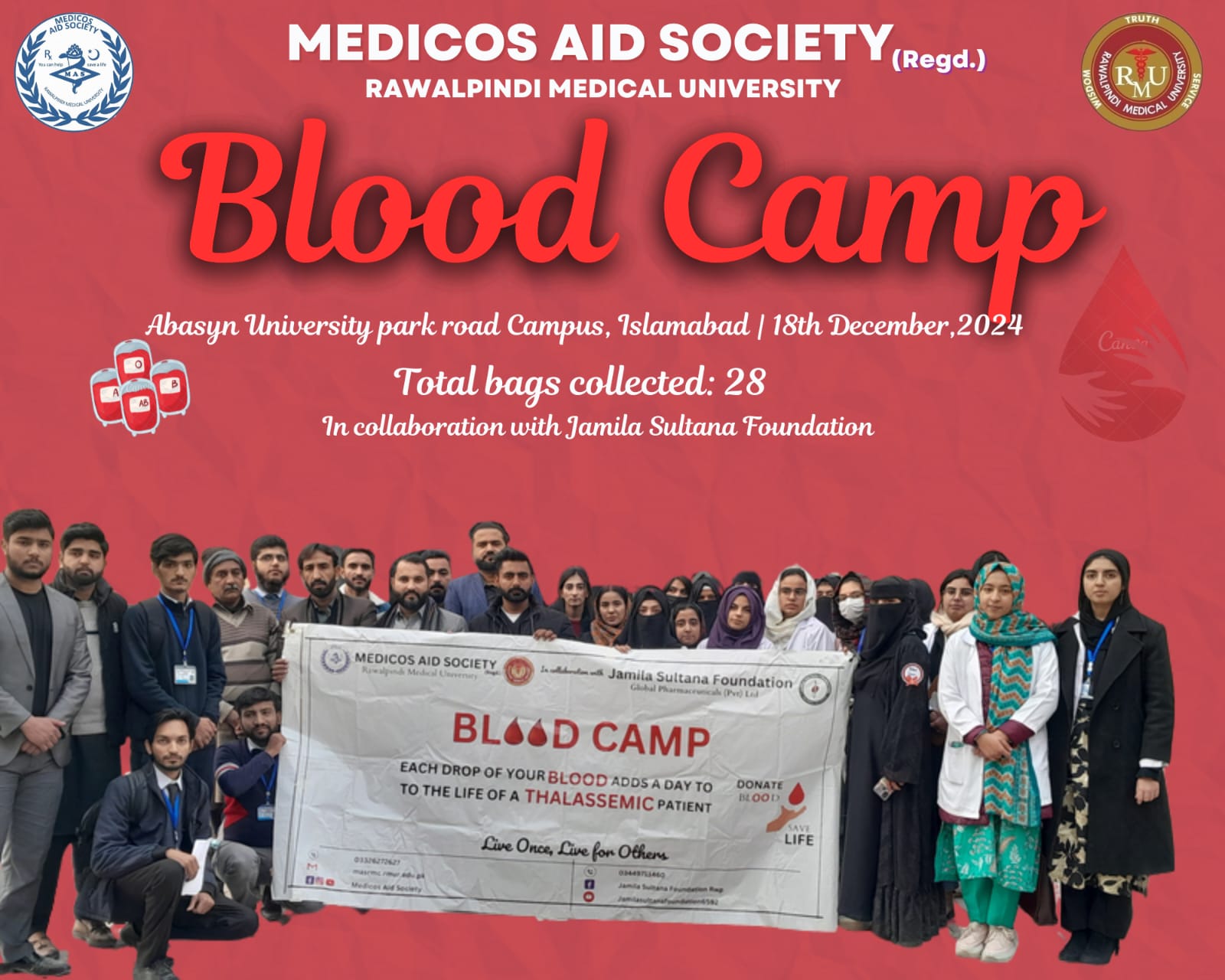 Medicos Aid Society, in collaboration with Jamila Sultana Foundation and AUIC Blood Donation Society organized a Blood camp at Abasyn University Park Road Campus, Islamabad on 18th December, 2024 and collected 28 Blood bags for the Thalassemic patients.
