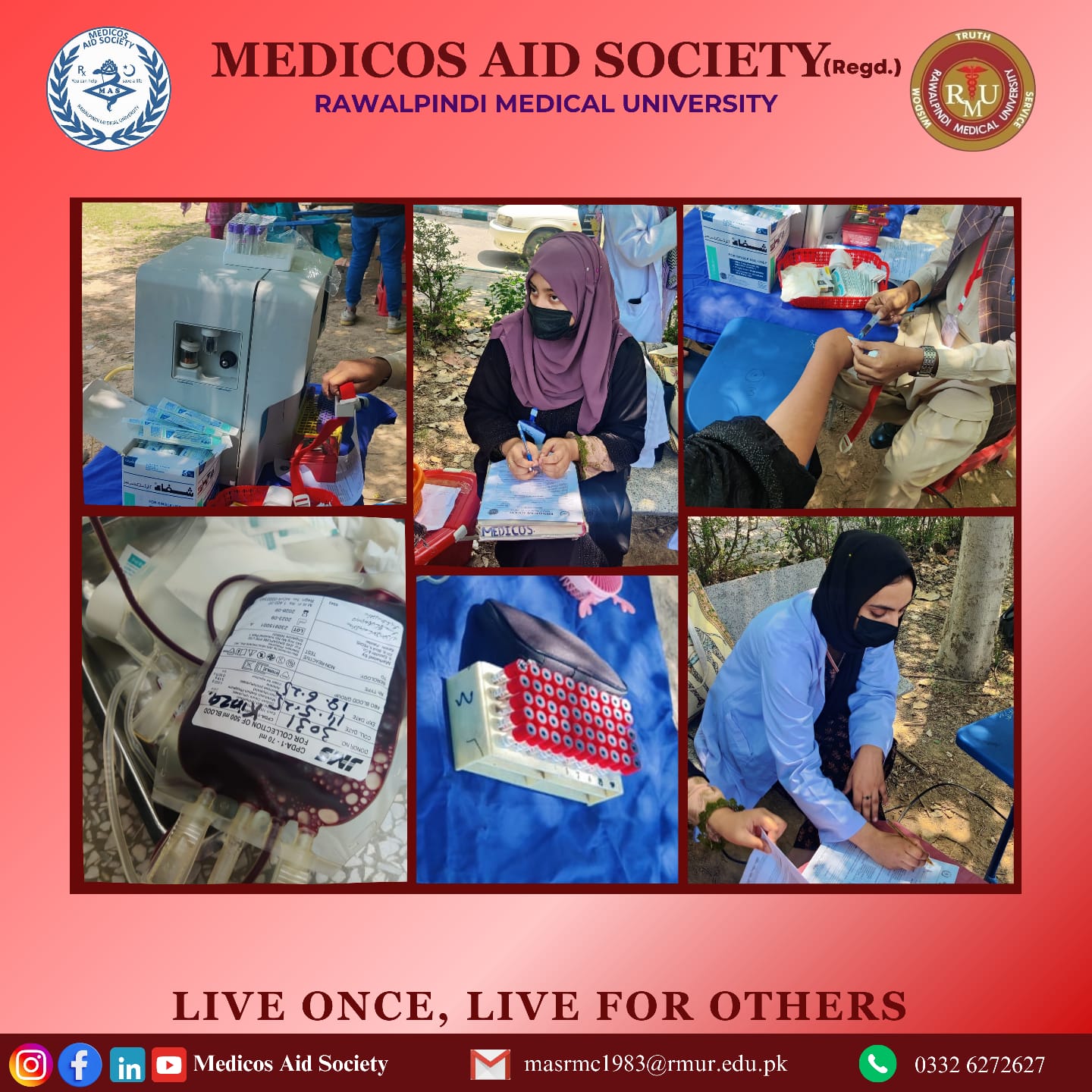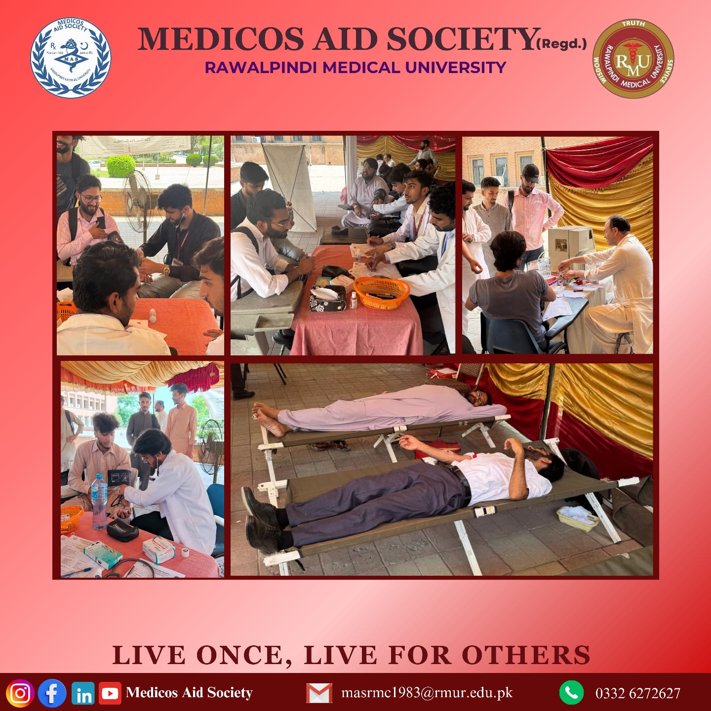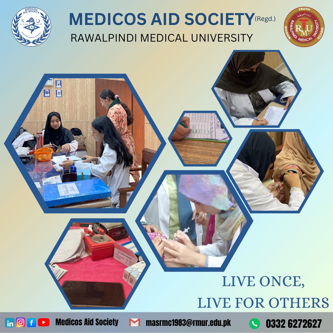 Medicos Aid Society is a student-based, non-political, welfare organization of Rawalpindi Medical University, organized in the name of selflessness, devotion and service. It was founded on 28th April, 1983 by Dr. Babar Alam, Dr. Amir Sherwani and his devoted fellows, with the aim of providing blood for thalassemic children. Since then, its members are actively and positively working for the poor and suffering humanity and doing all possible efforts to uplift the moral values of the sufferers by providing blood, medication and financial support. The society is registered with Social Welfare and Bait-ul-mal Department of Government of Punjab. It is working under the patronage of Vice-Chancellor RMU, Professor Dr. Muhammad Umar (Sitara-e- Imtiaz), for the betterment of mankind
