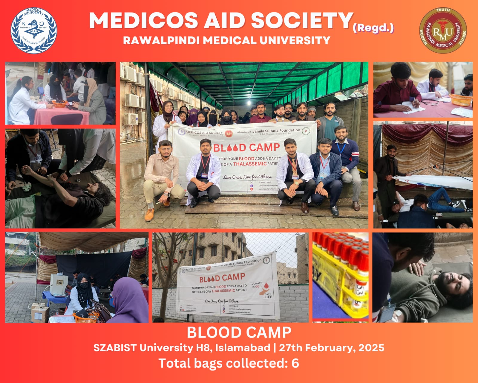 Medicos Aid Society, in collaboration with Jamila Sultana Foundation organized a Blood camp at Shaheed Zulfiqar  Ali Bhutto Institute of Science and Technology H8 Campus, Islamabad on 27th February, 2025 and collected 6 Blood bags for the Thalassemic patients.