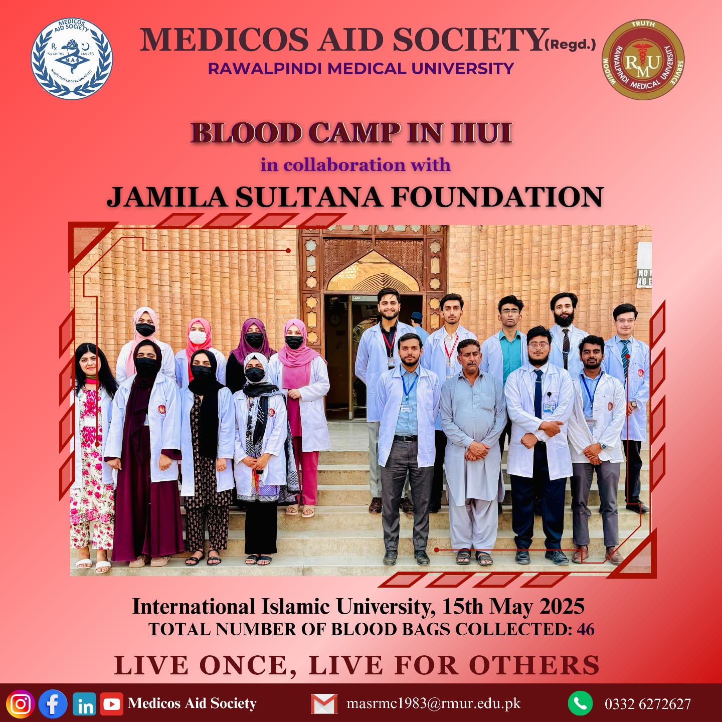 Medicos Aid Society, in collaboration with Jamila Sultana Foundation organized a blood camp at International Islamic University, Islamabad on 15th May, 2025 and collected 46 blood bags for Thalassemic patients.