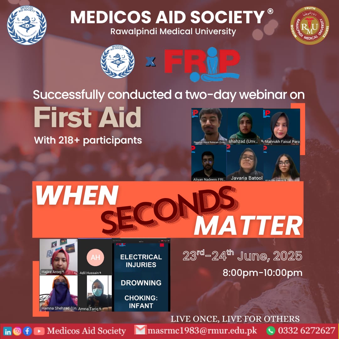 Medicos Aid Society conducted a two-day webinar, “When seconds matter,” along with First Response Initiative Pakistan on First Aid management on 23rd-24th June, 2025.