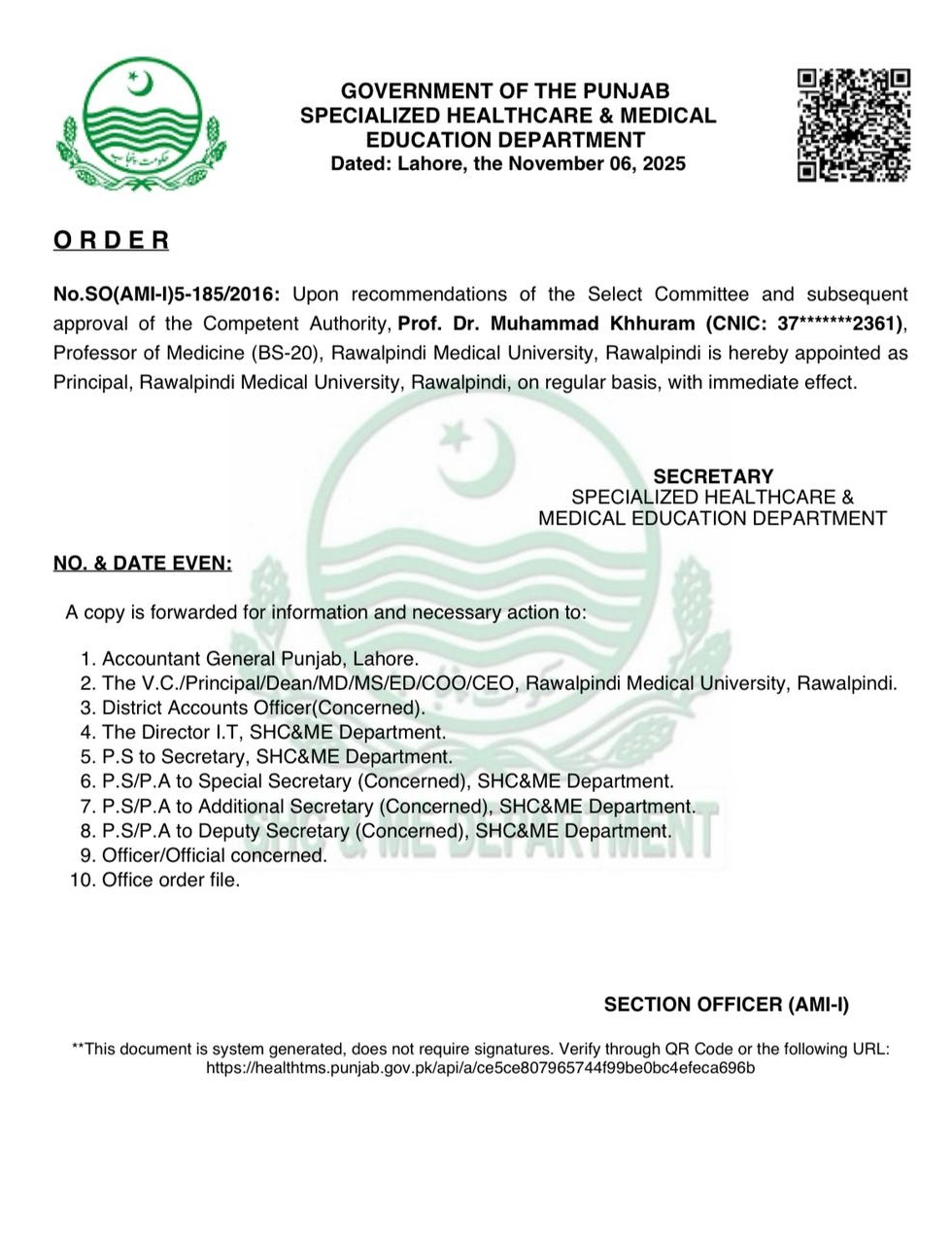 Professor Dr. Muhammad Khurram Appointed as Principal RMU
