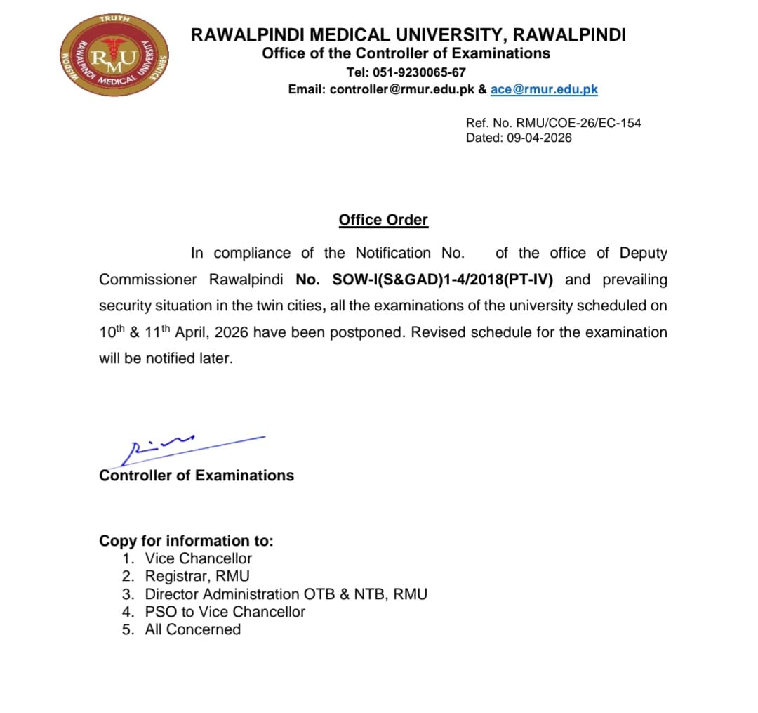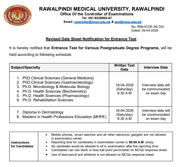 Revise Schedule for Admission Test for Postgraduate Programs – Postponed due to security reasons