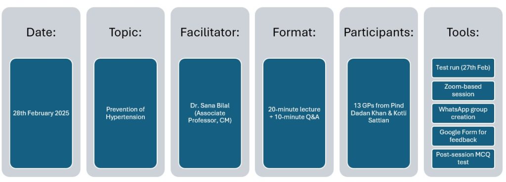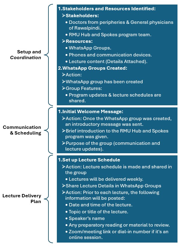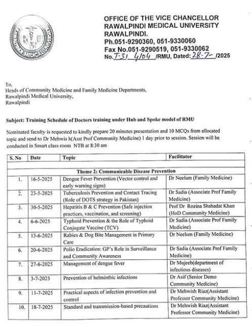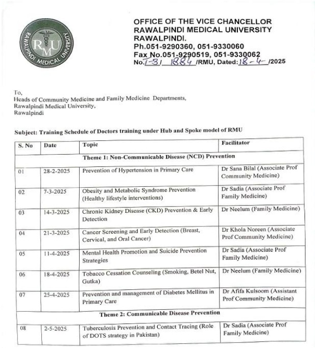 General Practitioners (GPs) form the backbone of primary healthcare in Pakistan. However, a structured, evidence-based training system for in-service GPs is lacking. To address this, Rawalpindi Medical University (RMU) launched the Hub and Spoke Program—a collaborative, decentralized training model to build GP capacity through academic linkages between RMU (hub) and healthcare facilities and practitioners in peripheral areas (spokes).